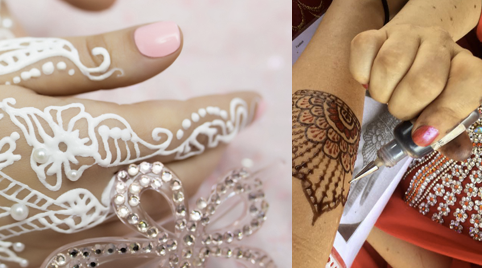 Witte henna is momenteel in de mode. Elegant en sneldrogend; een leuk alternatief voor glow-in-the-dark feestjes.